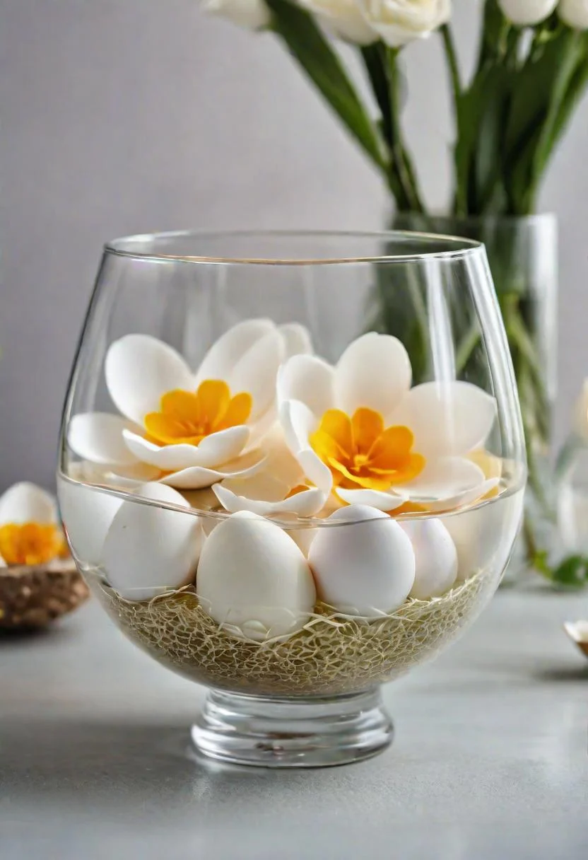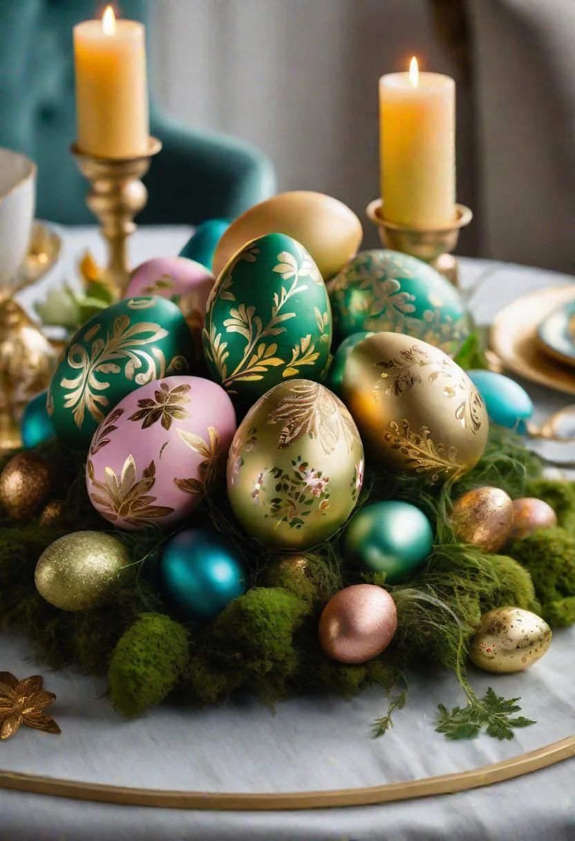 Fill a glass bowl or vase with gold embellished and glittery eggs. If desired, use moss as a liner.